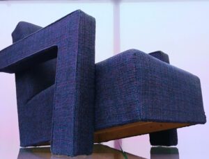 The name Vitra is synonymous with colour and comes across in their imaginative presentation of their current range at the Vitrahaus, Vitra’s showroom also on campus. The precision of newly manufactured design classics sit in contrast with their originals as seen in the Schaudepot. Being so close to the originals, I couldn’t help myself as an upholsterer but have a sneaky touch (I know!) but touch and feel is at the very core of what we do. Hans Wegner’s fully upholstered Ox Chair filled with latex foam had unsurprisingly largely disintegrated underneath the top fabric, yet the webbing and spring stitch of Gerrit Rietveld’s Lounge Chair designed in 1937 (this example dates between 1953 and 1973), the wool covering over PU foam and polyester wadding looks pristine. Like many avant garde designs, it was probably rarely sat upon. It was so interesting to examine the detail; Mies van der Rohe Cantilever Chair is laced in a fabulous linear pattern underneath to tension the fabric; I had always assumed it was stitched.